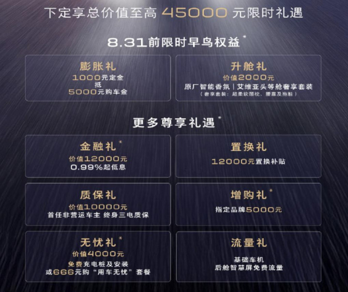 销售上,新车采用 “一口价” 模式,无论线上线下、何时购买,价格都统一,不用跟销售砍价,也不怕买贵,省心又透明。即日起下单能享总价值 4.5 万元购车权益,8 月 31 日前订车还有早鸟福利:1000 元定金抵 5000 元车款,直接省 4000 元,还送价值 2000 元的升舱套装,含超软颈枕、腰靠、拖鞋和原厂智能香氛,提车就能享头等舱待遇。