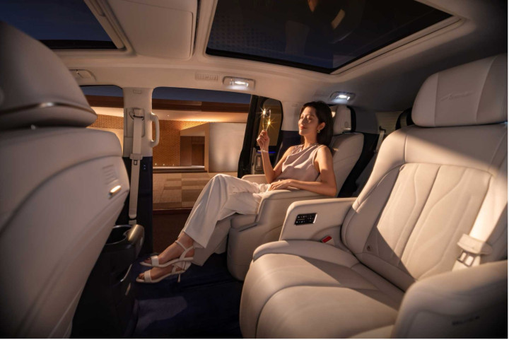 迎宾仪式感更是同级独一份:解锁靠近时,前后灯组亮 “云起雪飞” 灯语,隐藏门把手弹出;打开侧滑门,2.8 米银翼礼宾光毯铺开,还伴有迎宾音效,加上 128 色氛围灯,用车、接待都有面。